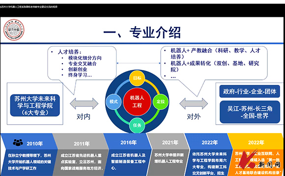 交流会上,陈国栋从机器人工程专业培养方案的主线与专业方向界定,机器人工程课程体系构建,机器人专业人才培养方向的确定与实施,数字化设计与数字孪生技术的课程边界与内容组合,教学条件建设规划,实验实习实训体系建设规划,以赛代课、以赛促学的实践和经验,师资队伍与能力建设七个方面详细介绍了苏州大学机器人工程专业课程构建情况。对数字化设计与数字孪生技术的课程设置与分布进行了重点讲解。