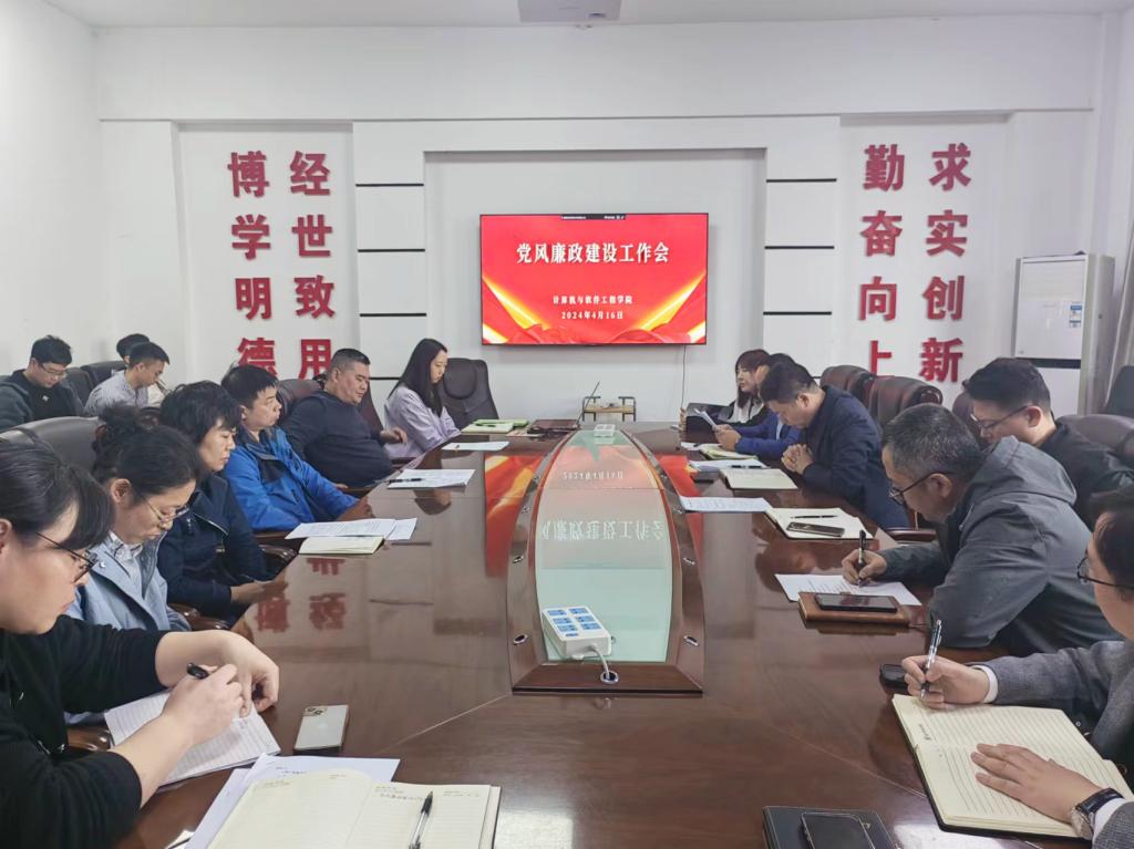 2024年4月16日,计算机学院党风廉政建设工作会在博识楼B327会议室召开,学院领导班子成员、科级以上干部、系(中心)主任、党支部书记参加会议,会议由院党委书记陶润城主持。