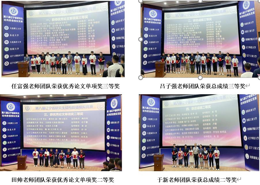 此次竞赛是辽宁省高校土木工程学科重要的研究生赛事之一,有来自东北大学、大连理工大学等12所省内高校土木工程学科的专家评委、参赛指导教师和49支参赛团队参加了竞赛活动。我校土木工程学院于新老师指导的耿心茹、李兴力、苗巧凤团队获得总成绩二等奖;田帅老师指导的隋彬、刘建帅、王天琦团队获得优秀论文单项奖二等奖;吕子强老师指导的秦恒博、杨佳妮、杨宇欣团队获得总成绩三等奖;任富强老师指导的王林鑫、田志华、贺馨瑶团队获得优秀论文单项奖三等奖。球友会获得优秀组织单位称号。