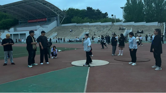 当我不好意思扔铅球的时候,同学们会开玩笑,缓解尴尬气氛;学长会耐心教我扔铅球的要领,每天的训练都在轻松愉快的氛围之中进行,所以疲惫的训练也变成了一件幸福愉快的事。