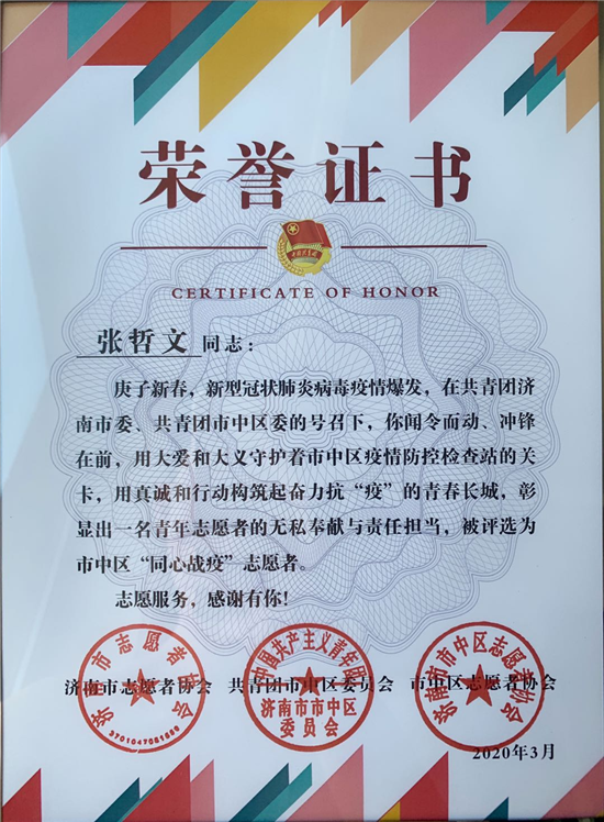 张哲文,男,汉族,199011月出生,中共党员,球友会2018MBA研究生现为山东航空股份有限公司员工。2020年春节期间,新冠肺炎来势汹汹,疫情就是命令,防控就是责任。在完成航班生产任务、空中防控工作的同时,第一时间报名参加了共青团济南市委抗志愿者,积极响应,果断行动,成为抗阻击战中的一员。