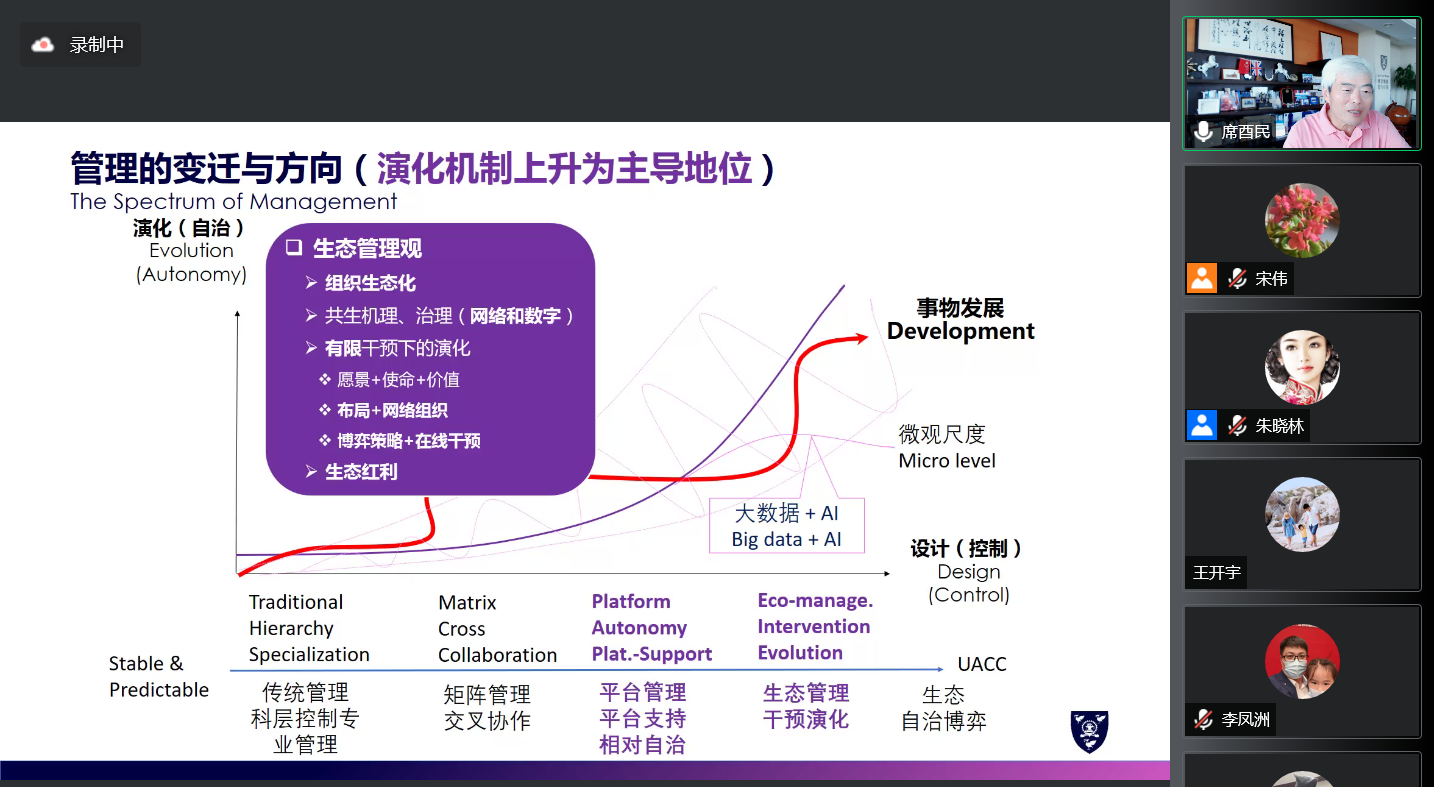 胡军副校长首先代表学校向席教授表示热烈的欢迎和诚挚的谢意,并对席教授进行了热情介绍。席教授的学术报告从产业生态演进入手,详细分析了产业的数字化转型和产业生态、产业家的孕育,在产业组织观和管理变迁的基础上探讨了产业家生态红利的创获问题。