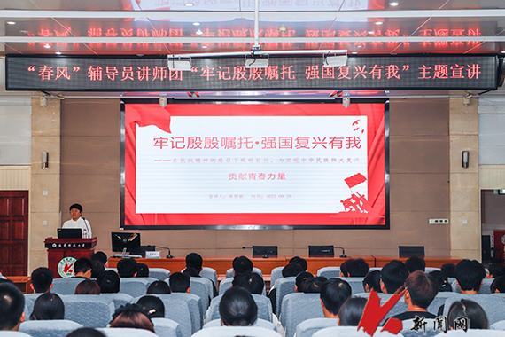 讲师团成员高朋敏从“回望、聆听、致敬、践行和奋进”5个层面回望抗日战争时期的烽火岁月,聆听英雄精神回响,致敬先辈不屈风骨,教育引导青年学子从抗战精神中汲取“不忘来时路”的初心力量,将“不负时代”的使命融入青春血脉,以“博学明德 经世致用”的校训为指引勇毅前行,将“勤奋向上 求实创新”的追求化为强国行动,在新时代的赶考路上书写无愧于时代的青春答卷。