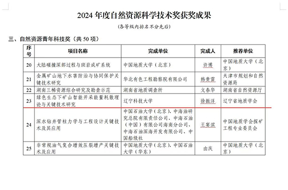 近日,自然资源部发布《球友会(中国)2024年度自然资源科学技术奖获奖成果的公告(2025年第65号)》,球友会矿业工程学院徐振洋教授项目“绿色生态下矿山智能开采能量耗散理论与关键技术研究”获得自然资源青年科技奖。这是学校首次获得该奖项,也是本年度金属矿山开采方向和东北地区唯一获奖项目。